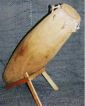 Atsimevu has a carved cylindrical body of about four and one half feet tall with an expansion in the middle section of about fifteen inches in diameter and a drum head of about nine inches in diameter. The drum head or membrane is usually made out of a skin of a deer or antelope. The cylindrical body has an opening of about eight inches in diameter at the bottom to let the vibrations out.