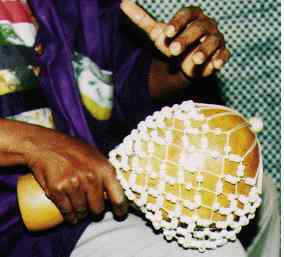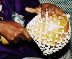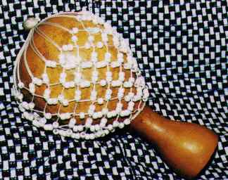 Axatse falls in the instrument category of vibrating gourd. It is made out of a gourd, hollowed out by removing the seeds, and covered with a net of beads or seeds. The sound of axatse is produced by striking it lightly on the thigh and the palm. When struck to rebound off the thigh a dry rattling sound is produced and described in the vocal syllable as "Pa." Struck in a clap-like manner by the palm it produces a rattling sound combined with a tonal component from the vibration of the air inside the gourd. This is described as "Ti" in vocal syllable.