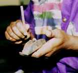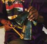 Gankogui, just like drums, is conceived as a surrogate for the human voice and imitates the manner in which the mouth produces speech. It is played with a stick technique while held in one hand and resting on the thigh of the performer who sits on a short stool with a firm relaxed body. The stick is swung as the hands go into motion supported from the elbows. The actual swing of the hand is done from the wrist. The stick is struck on the full rounded portion of the bell to achieve the best resonance. When the top high pitch is in use the forged-iron structure rests on the thigh and when the larger low pitch is in use it is raised slightly above the thigh. Stopping the resonance of the lower pitch after is is articulated by damping it on the thigh is equivalent to closing the mouth and provides the means of indicating the basic motives, phrases and periods out of which gankogui music is made.